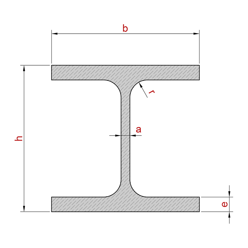 | Nome | Dimensione | Peso kg/m | b mm | h mm | a mm | e mm | r mm | Sezione cm2 | Momenti di inerzia Jx cm4 | Momenti di inerzia Jy cm4 | Moduli di resistenza Wx cm3 | Moduli di resistenza Wy cm3 | Raggi di inerzia ix cm | Raggi di inerzia iy cm |